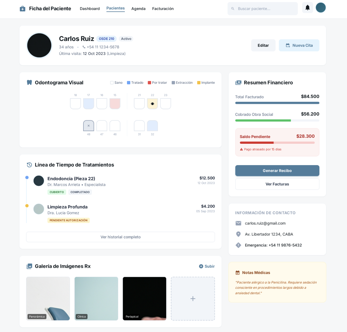 Una clínica odontológica con 3 sedes, 12 profesionales y 800 pacientes activos. Los turnos se tomaban por WhatsApp o llamada. Las fichas clínicas, en papel o en archivos de Word sin criterio. La facturación a obras sociales se hacía a mano, prestación por prestación, y siempre quedaba algo sin cobrar.
