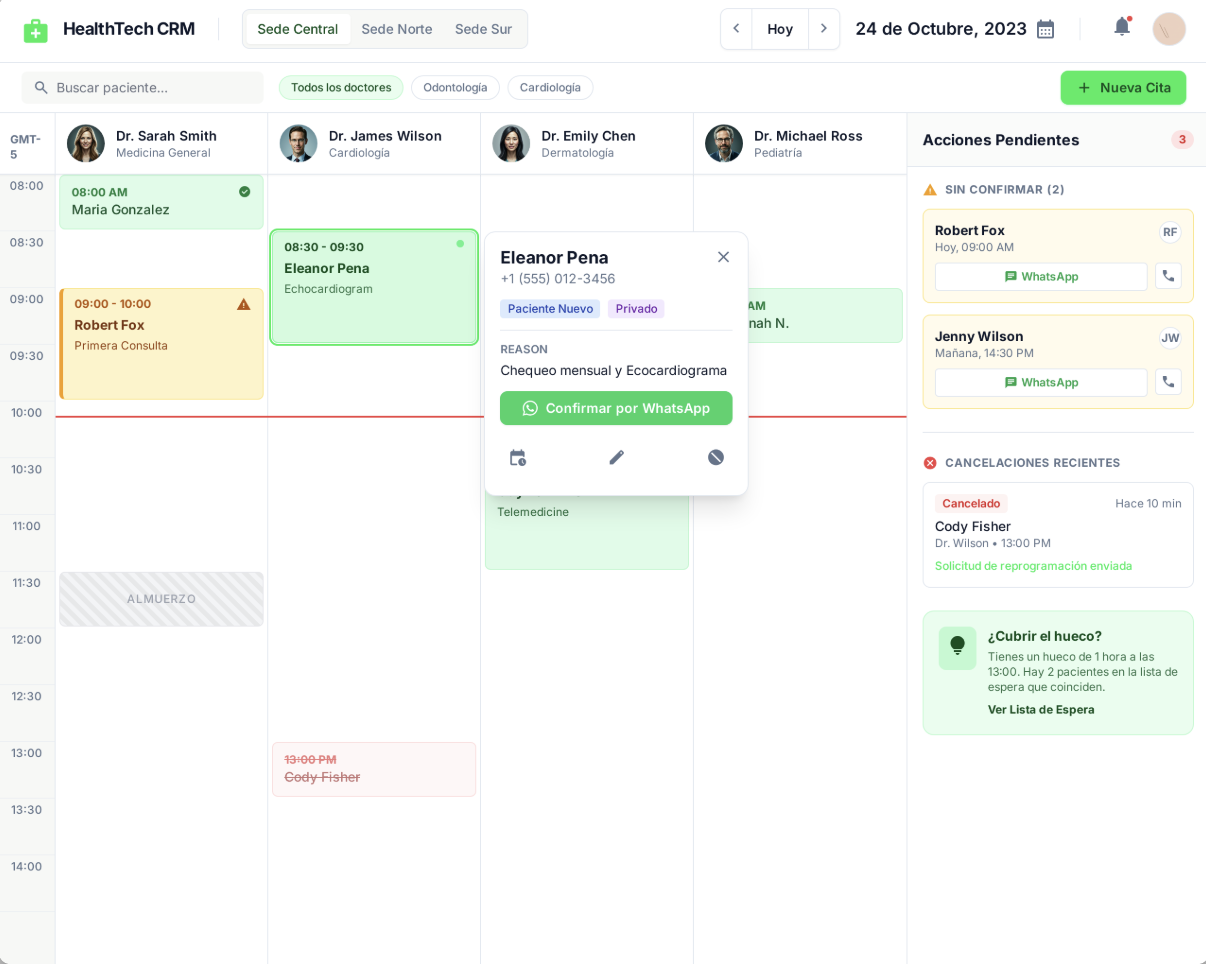 Con confirmación automática por WhatsApp — el paciente confirma con un click
